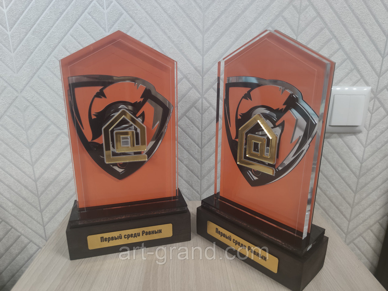 На фото - наградная наборная статуэтка "Первый среди равных" для сотрудников ТехноДома. Высота 26 см. Подставка - бук тонированный, основа - прозрачный акрил 15 мм, золотистый ромарк.
