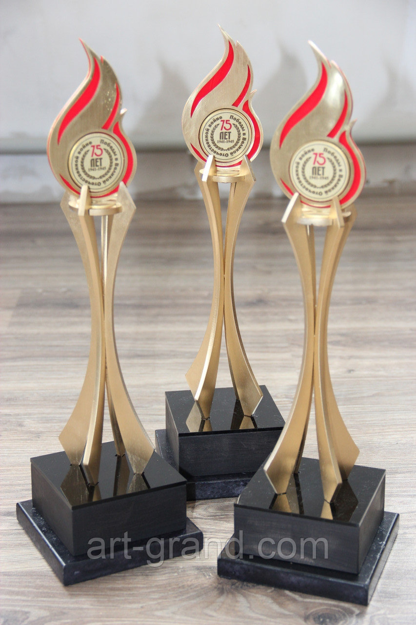 На фото - спортивные наградные статуэтки. Конструкция наград выполнена из металла - латунь с направленной текстурой, подставка дерево - бук 4 см и камня (габбро) -2 см. Пламя из латуни + красный акрил с Уф печатью.