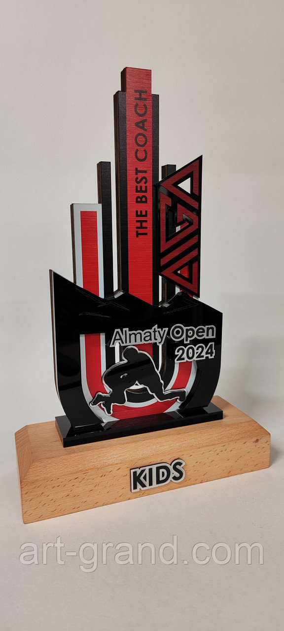 На фото - кубки по джиу-джитсу. Выполнены из черного акрила с высокоточной лазерной гравировкой, с накладками из ромарка. Подставка из бука. Высота от 25 до 32 см. Этот кубок является примером, но может быть дополнен или видоизменён по желанию заказчика.