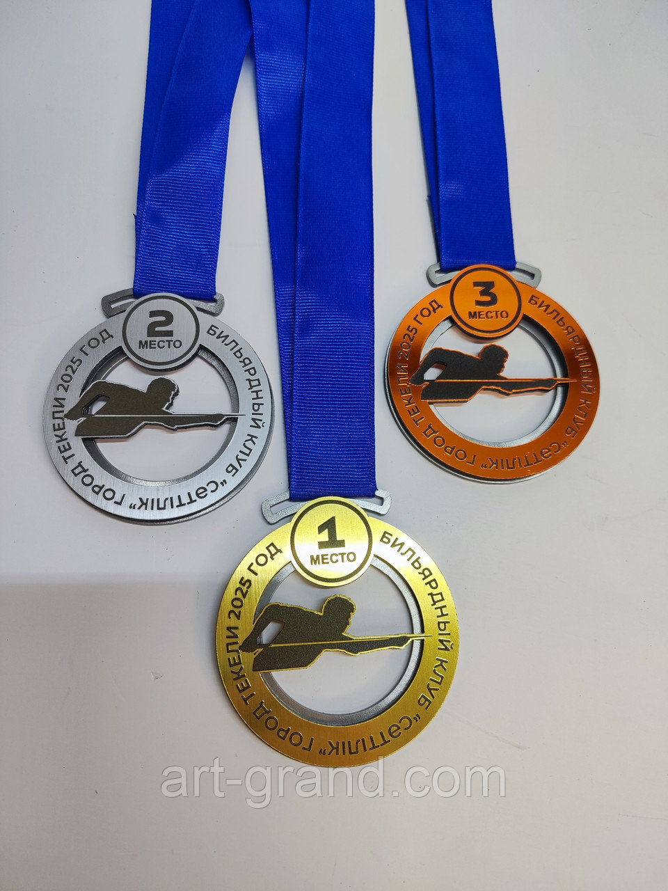 На фото медали для чемпионата по бильярду. Цельный металл (черный), накладки из роумарка + лазерная гравировка.
